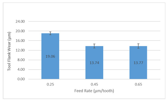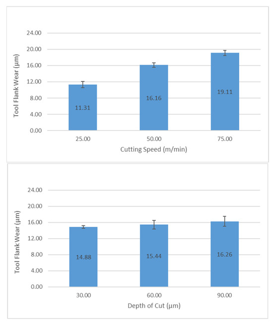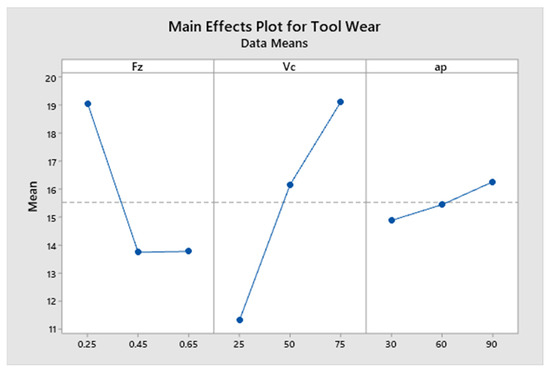 Elevated cutting temperatures represent a significant contributing factor to the swift onset of tool wear when machining titanium alloys [44]. In addition, previous research has indicated that higher cutting speeds result in a rapid rubbing action between the cutting tool and the workpiece, which generates heat that softens the tool’s flank face, consequently leading to increased abrasive wear [45]. Moreover, the increase in cutting speed during milling operations not only amplifies the frequency of tool edge entry into the workpiece but also intensifies the energy of the impact between the cutting edge and the workpiece, underscoring the pivotal role of cutting speed, particularly as the tool nears the end of its operational life [46]. The main effects plot further demonstrates that tool wear decreased with an increase in feed rate. Lower feed rates tended to be dominated by the ploughing mechanism, resulting in elevated tool wear. This phenomenon is closely related to the cutting-edge radius and its impact on shear and ploughing forces, as elucidated in other studies. Below the minimum chip thickness, both ploughing force and specific cutting force exhibited significant increases, culminating in heightened forces during micro-milling. It is also worth noting that tool wear declined when the feed rate transitioned from 0.45 µm/tooth to 0.90 µm/tooth.
