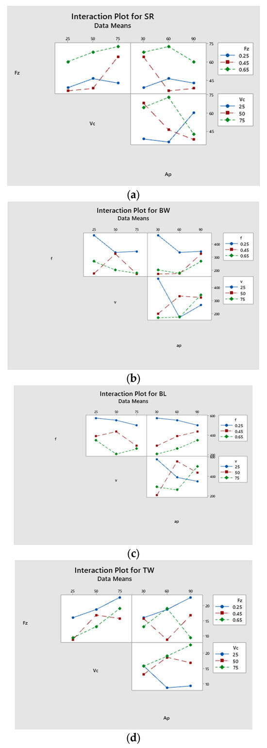 Interaction plots among fz, Vc, and ap: (a) surface roughness, (b) burr width, (c) burr length, and (d) tool wear.