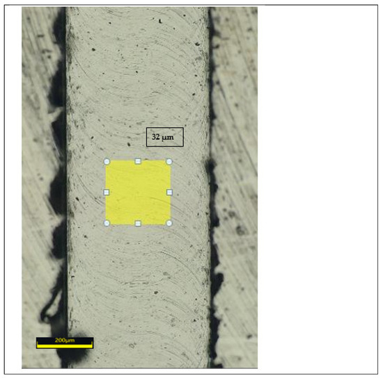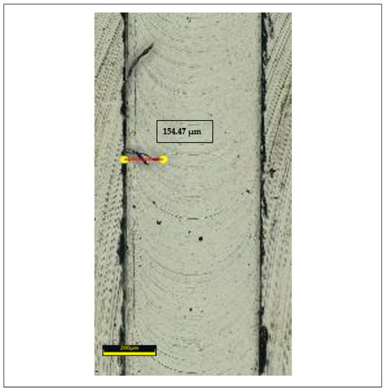 Confirmatory tests were carried out on the Taguchi design of experimentation to validate the authenticity of the achieved results. In this research, tool wear, surface roughness, and burr size were analyzed using a “smaller is better” model. The desired values of these input parameters, as determined from the input parameters in the main effects plot in Section 4, are presented in Table 11. Subsequently, validation experiments were conducted under these conditions, as presented in Table 12. It can be seen that an experiment was already carried out on one out of the eight machining parameter combinations during the initial design of the experiment (L9 orthogonal array). The rest of the conditions were run three times each. It was observed that all best and worst output response conditions yielded corroborative results. Figure 14 depicts the burr width value obtained from the optimal confirmatory test conditions, specifically at a feed rate of 0.65, a cutting velocity of 75 m/min, and an axial depth of cut set at 30 µm. The burr width was measured at 154.47 µm, which happened to be the lowest (optimized) burr width value, as expected. In comparison with the previous lowest value obtained during initial experimentation (at 0.45 fz, 25 Vc, 60 ap), 3.4% improvement was recorded. In Figure 15, the depicted data illustrate that a surface roughness of 32 µm was acquired under specific machining conditions of a feed rate of 0.25, a cutting velocity of 25 m/min, and an axial depth of cut set at 90 µm, which was 8.5% less than the initial best surface roughness value obtained at 0.45 fz, 25 Vc, and 60 ap.