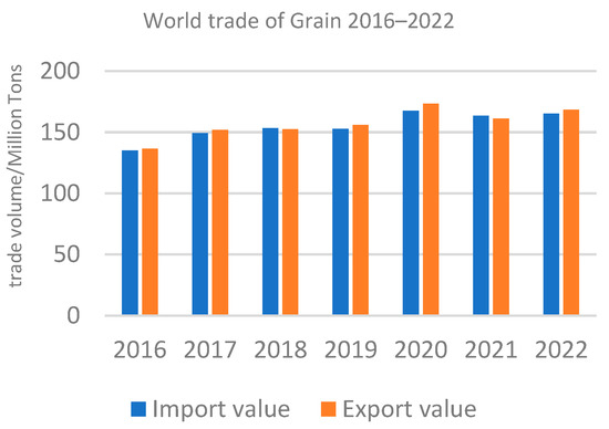 In recent years, the issue of cargo grain deterioration has received wide attention. Over the past five decades, the grain trade throughout the world has expanded rapidly [1], but almost one-third of the food produced worldwide is lost due to spoilage or waste [2]. According to the classification of the world’s major grain trade, soybean accounts for more than 20% [3]. The soybean trade throughout the world is 340.91 million tons in 2020, followed by 324.57 million tons in 2021 and 333.57 million tons in 2022, as shown in Figure 1. From the perspective of transportation mode, shipping is the main means via which the soybean is traded globally. Normally, a single ship can carry approximately 80,000–100,000 tons of soybeans. Once a cargo damage accident occurs, the loss may range from millions to billions (see Table 1).