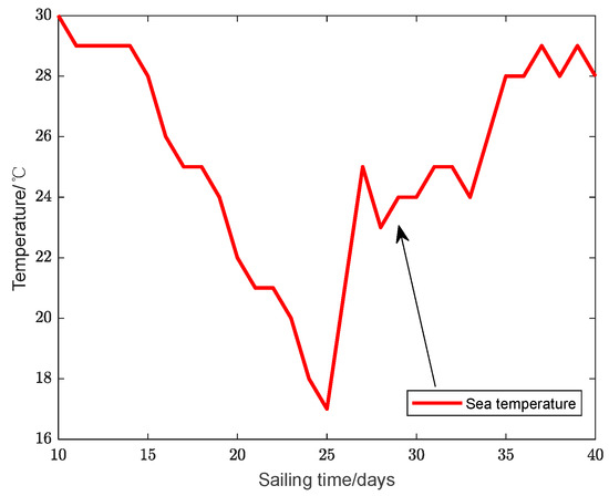 The change of sea temperature is another important factor affecting the shipside environment. In contrast to land-based silos, ships typically traverse vast latitudes, leading to significant fluctuations in sea temperature and substantial temperature differentials. In this paper, the sea temperature is intercepted from the historical chart data and drawn into a curve, as shown in Figure 3, and the data are imported into the software.