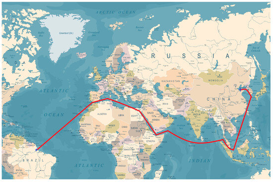M/V Bakebolan was selected for analysis of the effects produced by condensation inside the cargo hold. The ship departed from Brazil on 2 July 2019, through the Mediterranean Sea and the Gulf of Aden, and then went north through the Strait of Malacca to reach the Longkou port, China, 43 days later. The route is shown with the red line in Figure 4. According to the ventilation records, the ship was surface ventilated. In this paper, the fourth cargo hold of the ship was modeled to simulate the temperature and humidity fields in the ship’s cargo hold during the arrival at Longkou. The cargo hold parameters are shown in Table 2.