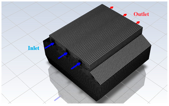 The cargo hold is meshed by the Multizone method, with various mesh densities selected for the lower soybean storage area and the air area at the top of the cargo hold, and the overall structured hexahedral mesh is employed. For improvement in the accuracy of the numerical simulation’s calculation results, the grid of the boundary layer is encrypted based on the curvature and narrow slit functions, and then generated 300 thousand grids. Figure 5 illustrates the cargo model and mesh division. After grid independence verification, the simulation results of this study are shown to be accurate and reliable, and meet the calculation accuracy requirements.