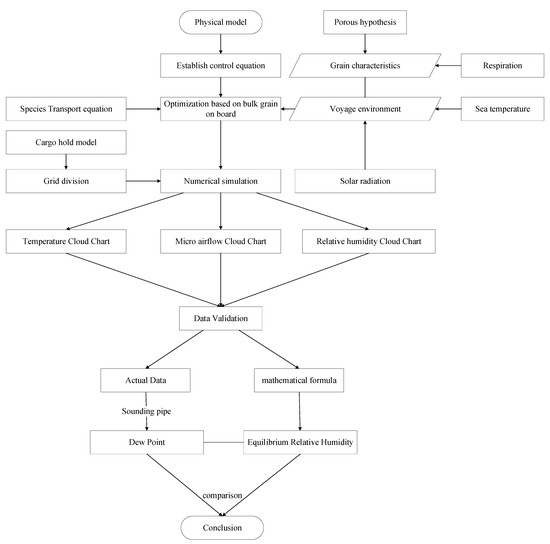 In summary, the research framework of this article is shown in Figure 6. Firstly, the basic physical model is established, and then the model is optimized and improved according to the particularity of the bulk grain cargo hold. The moisture equation and the heat source term are incorporated into the model in order to simulated the dynamic changes in humidity and temperature within the cargo hold, and the alterations in sea temperature and solar radiation are incorporated into the establishment of boundary conditions.