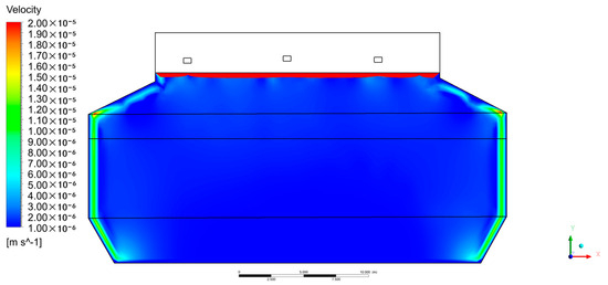 As can be seen from Figure 8, the micro-airflow in the soybean pores is mainly driven by the temperature gradient with a slow velocity, and the order of magnitude mainly resides at 10−6 m/s. It is obvious that the micro-airflow velocity at the shipside is higher in comparison to velocities observed at other positions. The micro-airflow inside the grain shows a closed trend, from the internal “hot core” from the bottom up to near the surface of the grain, then through the convection low-temperature wall from top to bottom, and finally through the bottom of the grain back to the center, which is counterclockwise. Due to the influence of self-heating on the internal temperature of soybean and convective heat transfer on the side, the temperature gradient gradually increases with the increase in navigation time, and the micro-airflow velocity is on the rise, reaching a maximum of 1 × 10−5 m/s, which also indicates that the natural convective flow of air inside the grain pile is Laminar Flow. The above analysis results are consistent with the description in the literature [18,41].