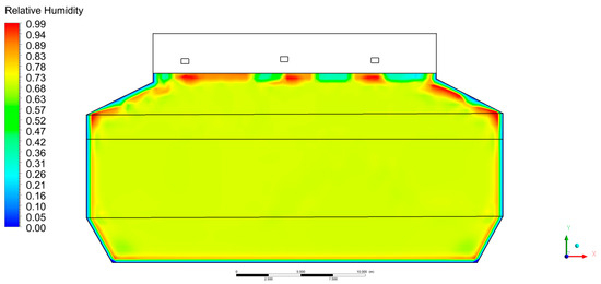 From Figure 9, the change in soybean humidity field varies with the change in temperature field and micro-airflow field. The relative humidity is high in the cargo near the shipside, and the relative humidity inside the grain decreases as the temperature rises. With the increase in transport time, the moisture content on the shipside is increasingly elevated. This is consistent with the principle of negative correlation between temperature and moisture in the stability of grain storage. The reason is that the temperature inside the grain is increased by respiration, and the temperature near the side is decreased by sea convection, resulting in a temperature difference between the inside and outside of the grain. Due to the proportional relationship between vapor pressure and temperature, the temperature difference leads to the generation of internal and external pressure differences. To balance the pressure difference, water vapor is transported from inside to outside, resulting in the generation of a high humidity area on the shipside. This area is prone to condensation, coupled with the influence of cold air on the low-temperature wall of the side.