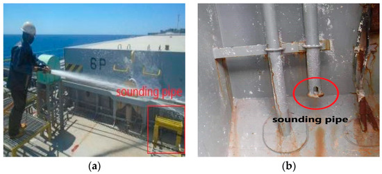 No.6 cargo hold sounding pipe. (a) Sounding pipe deck part; (b) Sounding pipe bottom part.