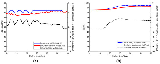 In this paper, the closest point to the bottom of the sounding pipe is selected in the model to compare with the actual ship data. Based on the findings presented in Figure 11, it can be observed that the difference between the simulation data and the actual ship data is below 5%, With the increase in navigation time, the difference between the simulated temperature and the measured temperature gradually decreases, and the minimum is 0.3 °C, while the difference between the simulated relative humidity and the measured relative humidity fluctuates at 4%. Simultaneously, it has been observed that alterations in temperature and humidity at the shipside are mostly influenced by fluctuation in sea temperature. However, it should be noted that the cargo hold environment discussed in this study is based on ideal conditions. In reality, the alteration of actual ship data is a more intricate process compared to the simulation data. However, over the entirety of the modeling phase, the observed fluctuations in average temperature and humidity of soybean closely align with those seen in actual ship conditions.