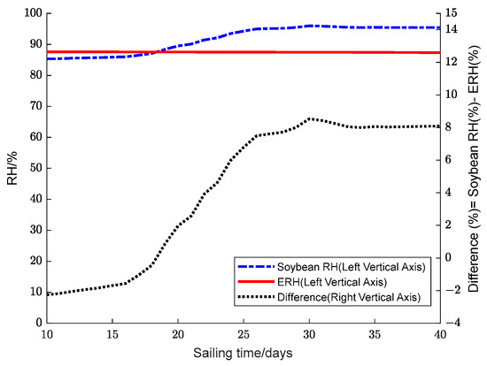 The curve of the ERH of the grain in the hold during the ship’s voyage since July 13 is calculated according to Equation (9); the actual relative humidity is used to compare with the ERH, and analyzed by calculating the difference.