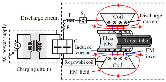 The pulse power source in this study employed capacitors. Specifically, eight capacitors were connected in parallel, allowing for individual operation. This setup enabled variations in peak current and frequency. Eight triggered switch units were utilized to discharge the capacitors into the coil. The total capacitance of the system was 512 μF, and the charging voltage reached 15 kV. Additionally, to measure the waveform, a Rogowski coil was placed at the junction where the pulse power source and the working coil connect.