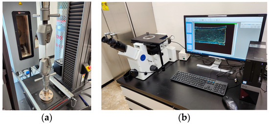 Setup for joint quality evaluation test. (a) Measurement of the maximum load. (b) Observation of weld length.