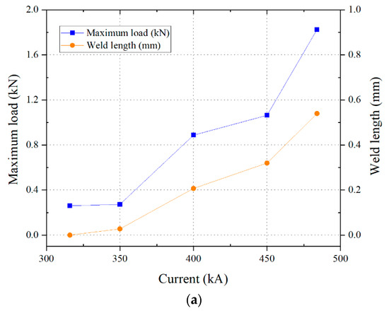 After conducting magnetic pulse welding under various welding conditions, tensile testing and optical microscopy were used to measure the maximum load and weld length, as shown in Figure 3.