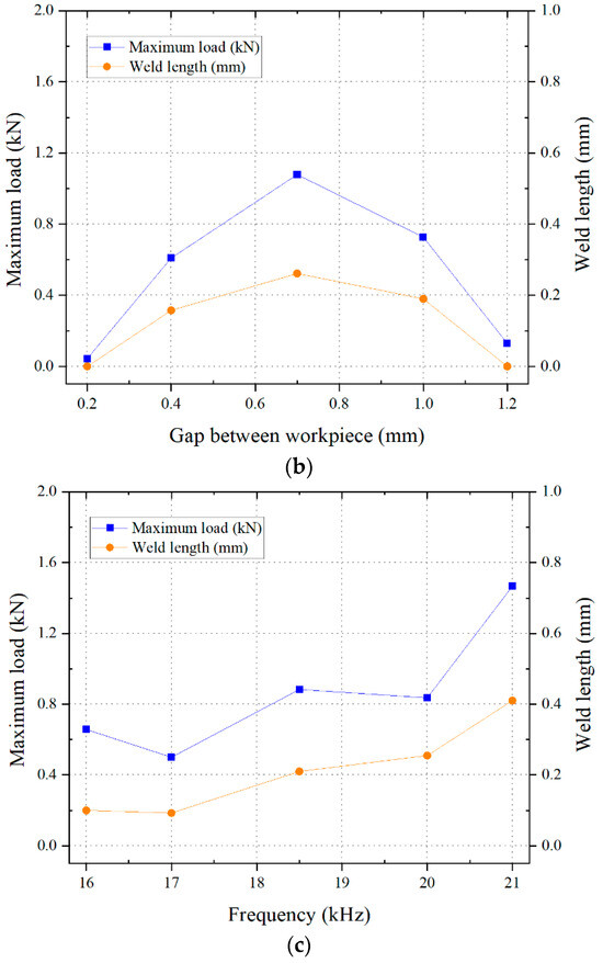 The peak current and frequency are closely related to the force required for collision with workpieces. If there is insufficient force, the welding may not be of high quality. Figure 4a,c show the effects of peak current and frequency. As the peak current and frequency increase, the maximum load also increases. The gap between workpieces has a role in accelerating the outer workpiece during welding. Notably, the influence of the gap between workpieces was significant; it has optimized values compared to others for achieving the high-quality joint in Figure 4b.