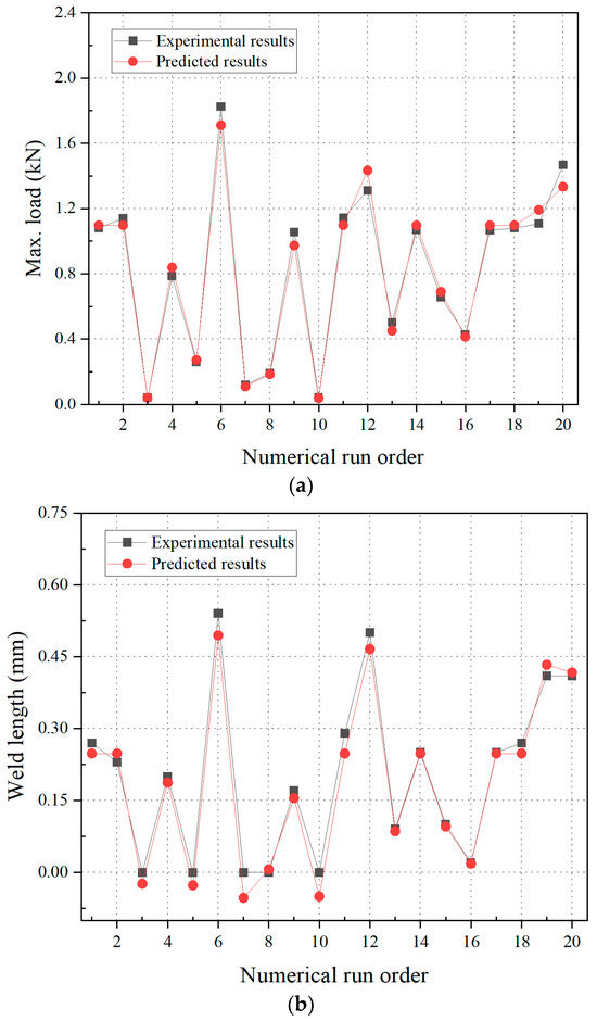 Figure 5 provides a comparison of measured and calculated results obtained using the proposed prediction model for maximum load and weld length. The predicted results agree well with the experimental results. Errors between measured and calculated values were found to be less than 10%, indicating that the proposed prediction model accurately predicted maximum load and weld length.