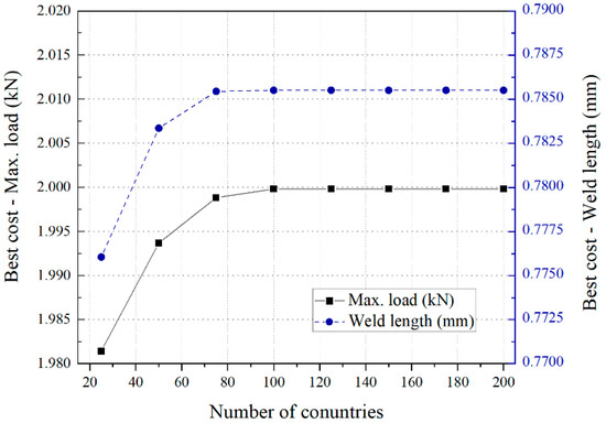 In this study, the effects of varying the number of countries on the maximum load and weld length were investigated. Figure 7 shows the effects of this variation on joint quality. The objective function displayed notable variation when the number of countries was below 80. Increasing the number to 100 marginally enhanced the results. However, further increments in the initial number of countries resulted in decreases in the objective function, although these changes were not significant. Table 9 shows the optimum algorithmic parameters for the ICA model, including the number of countries. These parameters were determined by trial-and-error. The optimization models were developed using the MATLAB R2018b platform, and the developed prediction models in Section 2.3.1 were embedded into the ICA and optimized.