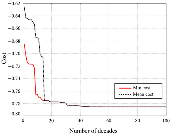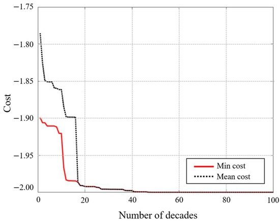 Figure 8 and Figure 9 show the average and minimum cost, indicating convergence to optimal values. The cost function exhibited a significant decrease in the first five decades. As the iteration proceeded beyond 35 decades, the variation in the cost function became minimal. Specifically, after 42 decades, the maximum load and weld length, which serve as objective functions in this study, were 2.00012 kN and 0.78892 mm, respectively.