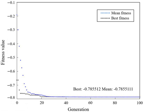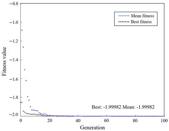 GA, a popular optimization algorithm, is derived from natural evolution processes and originates from Darwin’s theory of species evolution. J.H. Holland introduced GA in 1992 [26]. The algorithm utilizes chromosome representations, which are considered points in the solution space. The population’s chromosomes are processed through genetic operators to successively replace them. Typically, a GA involves three key steps: selection, crossover, and mutation. First, a random population of chromosomes is created, and the fitness of each chromosome is assessed [24]. If the termination criterion is not met, the process moves on to the following steps. However, if the criterion is met, the best chromosome is returned. The creation of chromosomes continues until a total of n chromosomes are generated [25]. The initial population represents the possible solutions to the optimization problem, and each possible solution is referred to as an individual [23]. A possible solution was formed by the values of the peak current (kA), the gap between workpieces (mm), and the frequency (kHz). The search for the optimum was based on the maximization of the load and weld length, which define the objective function. Table 10 presents the GA parameters that yield the best results: a mutation rate of 0.008, a population size of 100, and a maximum number of generations of 100. Figure 10 and Figure 11 depict the results achieved using the optimal process parameters obtained through GA. These parameters were determined in just 45 generations for the Al/Steel MPW joint. The maximum load and weld length, defining the objective function, were found to be 1.99929 kN and 0.78551 mm, respectively.