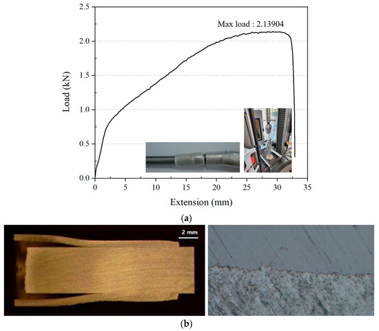 The optimized process parameters were 484 kA, 0.73 mm, and 21 kHz for peak current, gap between workpieces, and frequency for achieving maximum weld length. Verification of the selected optimal process parameters was performed. The experiment used the optimized process parameters from Table 11 for the joining conditions. After welding, joint qualities were tested according to the maximum values of load and weld length. Figure 12 shows the results of the verification test. The joint at the Al tube was broken, indicating that the strength of the weld joints is greater than the strength of the weaker parent materials, as illustrated in Figure 12a. The maximum load was measured at 2.139 kN. The weld length was measured at 0.8 mm on the joint, as shown in Figure 12b.
