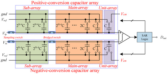 The structure of the proposed N-bit SAR ADC is shown in Figure 1. It consists of a positive-conversion capacitor array, a negative-conversion capacitor array, a DAC driver circuit, sampling switches, a comparator, and SAR logic. Each conversion capacitor array is composed of a main array, a subarray, a unit array, and a bridged switch.