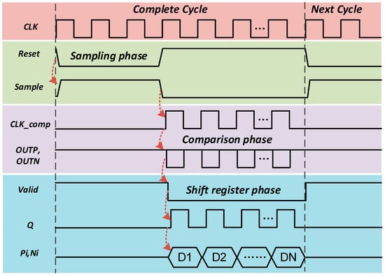 The overall sequence of the N-bit SAR ADC is shown in Figure 2. The clock signal (CLK) and the reset signal (Reset) are provided externally to enable the whole ADC to function properly. The SAR ADC operates in three phases: the sampling phase, the comparison phase, and the shift register phase. In the sampling phase, the Reset goes through a CMOS inverter to produce the sample signal (Sample). In the comparison phase, the CLK and Sample enter the comparator to generate each comparison signal (CLK_comp), after which the results of the comparison (OUTP and OUTN) are output. In the shift register phase, the Reset is used as a start signal in the first bit-slice circuit of the SAR logic, while Valid is generated by the comparison results (OUTP and OUTN), causing the SAR logic to output comparison results (Pi and Ni), and at the same time, it outputs Q signals for shifting and latching.