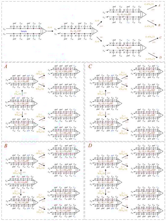 The operational rules of the proposed switching strategy are explained using a 5-bit SAR ADC. The operation consists of a sampling phase and five comparison phases, as shown in Figure 3, where the 4th comparison phase can be repeated up to N-1 times.