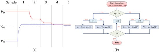 Figure 4. Diagram of voltage change: (a) waveform of the proposed switching scheme; (b) flow chart of the 10-bit SAR ADC.