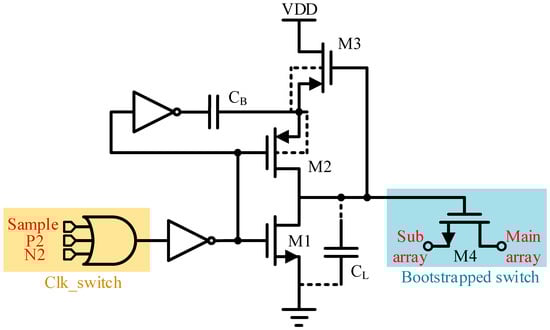 The sampling circuitry is located at the forefront of the entire SAR ADC, and its performance level directly determines the upper limit of performance that the ADC can achieve. In order to improve the performance of sampling switches and reduce the sampling errors, bootstrapped circuits are often used for sampling switches. Bootstrapped switches improve the on-resistance stability of sampling switches [15,16]. The principle of a gate-voltage bootstrapped switch is to provide a constant gate source voltage to the MOS switch through the bootstrapped circuit when the switch is on, and the magnitude of this constant gate source voltage is close to the supply voltage.