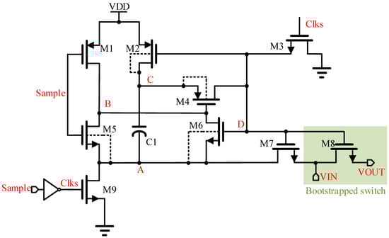 The bootstrap process consists of two phases, which are illustrated by the structure diagram shown in Figure 7. In the first stage, the sampling switch is reset when the sampling signal (Sample) is low and the CLK is high, with M1, M3, M4, and M9 being ON and M2, M5, M6, M7, and M8 being OFF. The point A and D voltages are low, and the point B and C voltages are high. In the second stage, the Sample is high; the sampling switch is closed; the CLK is low; M1, M3, M4, and M9 are OFF; M2, M5, M6, M7, and M8 are ON. The voltages at points A and D are high, and the voltages at points B and C are low. When the voltage at point A changes from ground to VIN, the voltage at point C changes from VDD to VDD + VIN, so the voltage at point D also becomes VDD + VIN.