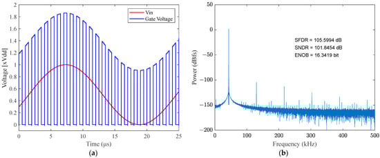 The output waveform of the input sine wave for a 100 khz clock signal is shown in Figure 8a, where it can be seen that a fixed difference between VIN and gate voltage is maintained at about VDD to ensure that the gate voltage follows the input variation. The FFT of the sampling switch is shown in Figure 8b; the SFDR and SNDR are 105.59 dB and 101.84 dB, respectively, and the ENOB is 16.39 bit, which meets the 10-bit SAR ADC requirements.