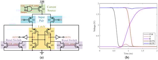 Dynamic comparators have no quiescent current, have the advantages of speed and low power consumption, and are widely used in ADCs. Usually, in comparator applications, NMOS is used as the input port of dynamic comparators [17,18,19], but in this work, PMOS is used as the input port to improve accuracy, as shown in Figure 9a. Dynamic comparators have two operating states, the reset state in the first stage and the comparison state in the second stage. In the first stage, the Sample is constant and high, so the CLK_comp, generated by the OR gate, is high. At this time, M1 is off; M6, M7, M10, and M11 are ON; A and B voltages are grounded; and OUTP and OUTN are high. In the second stage, the CLK_comp is low when the Sample is constant and low, and the CLK drops; M6, M7, M10, and M11 are OFF; VDD of A is charged via M1, M2, and M4; and VDD of B is charged via M1, M3, and M5.