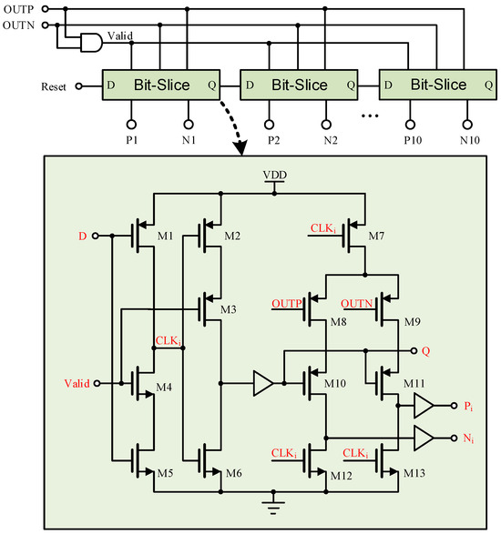 During the sampling phase, the Reset is low, and both OUTP and OUTN are high, so the Valid output through the AND gate is also high; then, Pi and Ni in all bit-slice circuits are reset to “0”. When the Reset increases to indicate the end of the sampling phase, D of the first dynamic logic increases, causing CLK1 to decrease. At this point, if OUTP > OUTN, P1 increases, and N1 remains low. In contrast, if OUTP < OUTN, P1 remains low, and N1 increases. When Valid decreases, P1 and N1 of the first comparison output are latched, and Q of the initial bit-slice circuit increases to indicate that the conversion is complete. The Q of the previous bit-slice circuit is used as the D of the next bit-slice circuit, causing it to repeat the operation of the first bit-slice circuit until all 10 bits of data have been saved.
