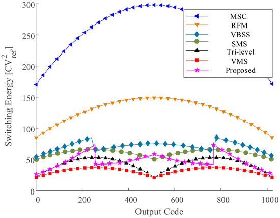 Table 1 compares the characteristics of several switching schemes [8,9,10,11,12,13]. In contrast, SC [7], which splits the largest capacitor in the array into subarrays, has higher average switching energy consumption, although it has the advantage of having low complexity and no common-mode shift. MCS [8] proposed, for the first time, a top-plate sampling technique that allows the first comparison to consume no energy and reduce the area by 50%; for this reason, the response of the scientific community was significantly positive, and it became a mainstream technique for SAR ADCs adopted by most researchers. RFM [9] uses a C-2C dummy capacitor; this type of scheme is less complex, but the Vref/2 common-mode shift reduces the linearity of ADCs. VBSS [10] proposes a bidirectional single-side technique based on Vcm that uses symmetrical switching to keep a constant common-mode voltage even after the first comparison, reducing the number of common-mode shifts. SMS [11] proposes an overall shift-monotonic technique that switches one side of the capacitance to the same reference voltage in the second-comparison step without generating switching energy and a common-mode shift of only Vref/4. Tri-level [12] entails the multiple switching of the reference voltage of the same capacitor, effectively reducing the switching energy required and the area used. VMS [13] combines top-plate sampling techniques and shift-monotonic techniques from capacitor arrays, further reducing the switching energy required.