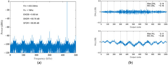 DNL is the maximum value of the difference between two adjacent scales of an ADC, and INL is the degree of deviation of the actual converted level from the ideal converted level. Both DNL and INL are static characteristic parameters of ADCs; hence, in this work, we performed a simulation at the input frequency of 43.33 kHz, as shown in Figure 12b. The peak values of DNL and INL were −0.16/0.14 LSB and −0.25/0.11 LSB, both of which are less than 0.5 LSB.