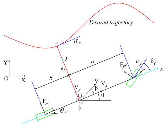 Because the front wheel steering angle is small, the lateral force and side slip angle have a linear relationship, and the dynamic Equations (1) and (2) are obtained as follows: