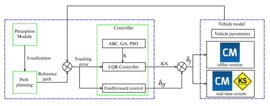 Figure 2 shows the entire structure of the LQR controller for an automated vehicle, which includes four main parts: the perception, path planning, controller, and the vehicle model. In path planning, the EM planner [39] is used to generate the reference path and path tracking errors. As the path planning module is not the focus of our work, the exact algorithm can be referenced in the GitHub project [40].