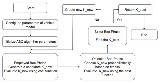 Figure 3. Flow chart of ABC and LQR controller. - Genetic algorithmThe GA [43,44] draws inspiration from biological principles such as mutation, crossover, and selection. The GA commences by configuring the parameters of the BMW car, the initial K values, as well as randomly generated individuals, initiating the evolutionary journey. In each generation, the fitness of every individual is evaluated, typically by assessing the value of the fitness function. Stochastic selection is employed to favor fitter individuals from the current population. These selected individuals’ genomes are then subject to modifications, such as recombination and possibly random mutations, to generate a new generation of candidate solutions. This cyclic process continues, with the newly formed generation becoming the basis for the subsequent iteration. The GA advances through iterations until it reaches a termination condition. The flowchart of GA-LQR is shown in Figure 4.
