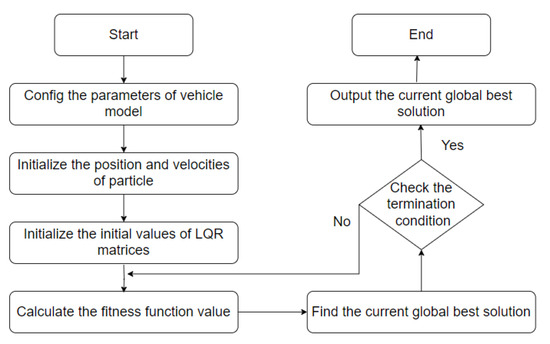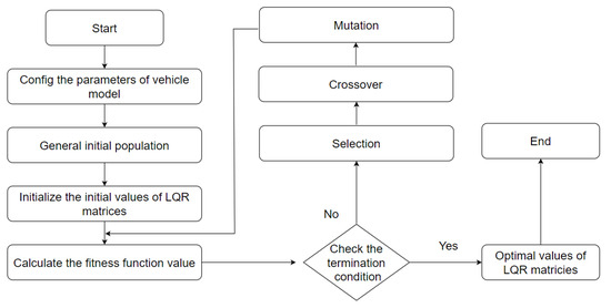 Figure 4. Flow chart of GA and LQR controller. - Particle swarm optimizationFigure 5 illustrates the flowchart of the PSO algorithm [45] and LQR controller. The optimal weight factor is found by searching for the global in order to enhance the LQR controller performance. Firstly, the parameters of the BMW car model are configured. Then, we set the initial particles’ positions and velocities as well as the initial values of LQR matrices. After that, the algorithm will calculate the fitness function value and find the global best solution. If the condition is satisfied, the algorithm is stopped, otherwise, the algorithm continues to run until satisfies the condition.