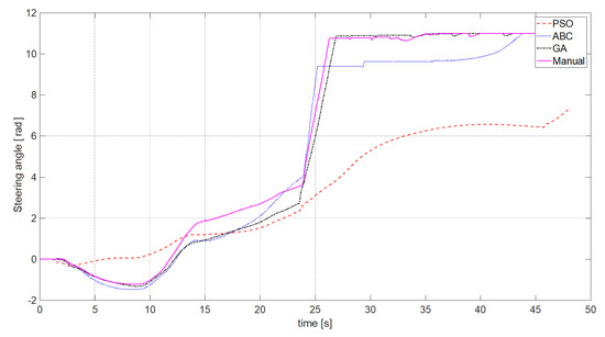 Figure 7 shows the steering angle of the vehicle in four cases using manual calibration, ABC, GA, and PSO algorithms. In the interval spanning from the 4th to the 10th second, alterations in the steering angle were observed for the manual calibration, GA, and ABC algorithms, registering an approximate variation of 1.9 rad. Conversely, the steering angle adjustment remained negligible when employing the PSO algorithm. Moreover, at the 24th second, a sudden soar in the steering angle occurred within a span of 3 s, for the Manual calibration, GA, and ABC algorithms. This value then stabilized thereafter at approximately 11 rad. In contrast, the steering angle change generated by the PSO algorithm exhibited a gradual increment, culminating at 8 rad by the conclusion of the aforementioned timeframe. Therefore, the PSO algorithms can prevent the centrifugal acceleration experienced in the vehicle. Consequently, this incremental approach has the capacity to enhance both the precision of lateral displacement and the lateral velocity measurements.