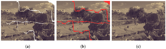 Application example of the inpainting approach. (a) Image for restoration; (b) detail of areas (in red) for reconstruction; (c) reconstructed output image.