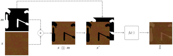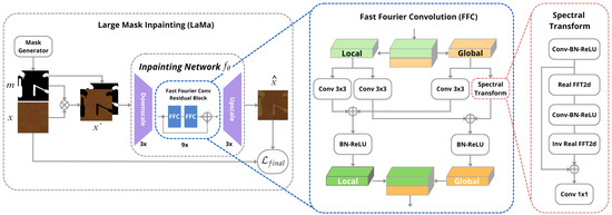 The purpose of the LaMa network is the reconstruction of the image’s patches x, partially covered by a binary mask m of unknown pixels, generating the masked image denoted by . The m mask is stacked with the masked image , resulting in a four-channel input tensor , as illustrated in Figure 2. A feed-forward inpainting network is used, which is also called a generator. Taking , the inpainting network processes the input in a fully convolutional manner and produces a three-channel image . Training is carried out on a set of data pairs (image, mask) obtained from real images and synthetically generated masks.