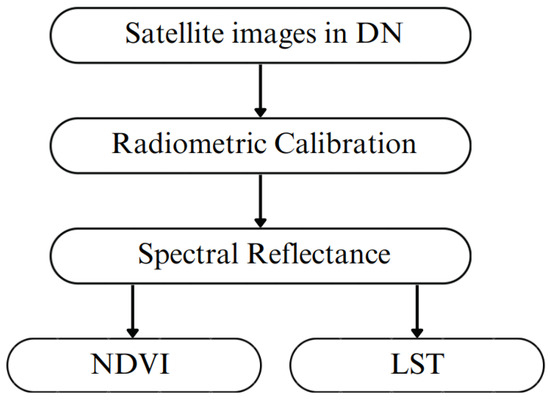 Figure 5 shows the steps taken in this analysis. From the digital satellite images, radiometric calibration is carried out to generate the reflectance for each image band, and the vegetation index and surface temperature are calculated from this reflectance.