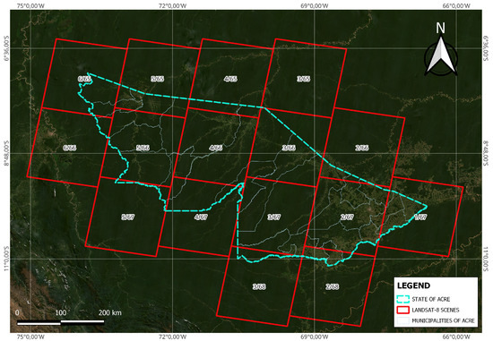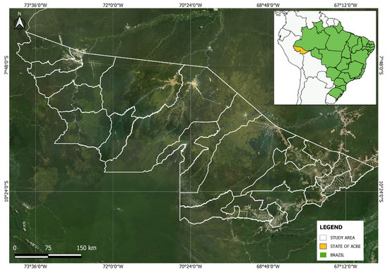 The Acre state, localized in the northern region of Brazil, was chosen as the study area for this research. According to the Brazilian Institute of Geography and Statistics (IBGE (https://cidades.ibge.gov.br/brasil/ac/panorama, accessed on 13 October 2023)), Acre has 830,026 inhabitants, with a population density of 5.06 inhabitants per km2, with a human development index (HDI) of 0.71, an urbanized area of 216.14 km2 and a land area of 164,173.429 km2. Figure 6 shows the study area.