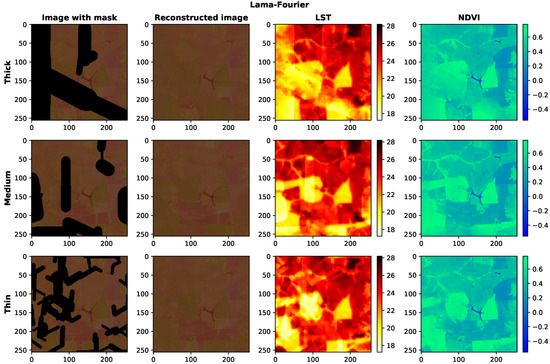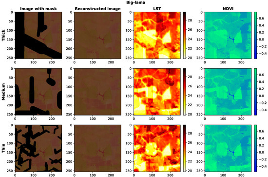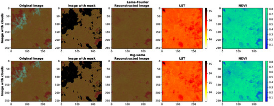 It is clear that are differences between the synthetic clouds and the real clouds, so experiments were carried out on images with cloud coverage. Figure 16 shows the image reconstruction results and their respective LST and NDVI. It was found that the two algorithms achieved visually adequate results for the reconstructed image and its LST, but we can see from the NDVI in the region where the largest cloud was located that there is a difference between the results from the LaMa and Big LaMa network. According to Table 1, when the intervals in NDVI are between 0.4 and 0.6, this indicates a medium vegetation, and between 0.6 and 0.8 this indicates a dense vegetation; therefore, while examining the cloud region, the NDVI can indicate a dense vegetation for LaMa and a medium vegetation for Big LaMa. This can be harmful to remote sensing analysis.