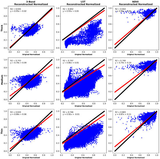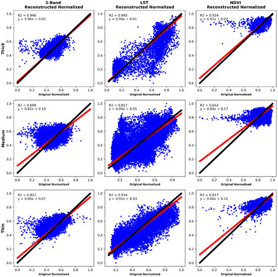 Scatter plots of the image reconstruction using the Big LaMa model. The black straight line represents the original image, while the red line represents the analysis of the reconstructed image versus the original image for three different scenarios. Each row corresponds to a specific scenario and each column corresponds to the reconstructed image, its LST and NDVI, respectively.