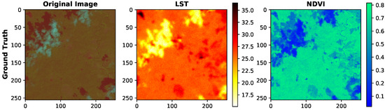 Figure 11 shows an image without cloud cover, which is considered the original reference image for the experiments. In the same figure, one can see their respective calculated LST and NDVI, which represent the temperature and vegetation characteristics present in the reference image. For comparison purposes, the ground truth image was considered throughout the image reconstruction process presented in this paper.