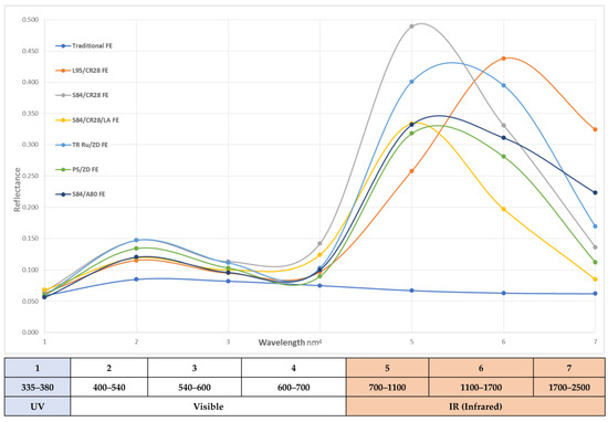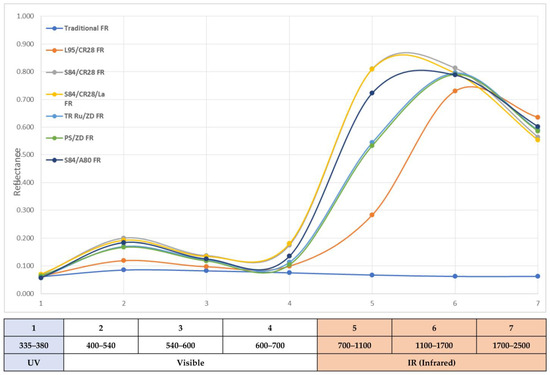Analyzing the curves in Figure 2, it is clear that the traditional coating shows the worst reflective characteristics. The best results were obtained by the coatings S84/CR28 and S84/CR28/Lacquer. Similarly, a good result was measured for the S84/A80 coating. In other words, the best results were provided by coatings with infrared transparent properties.