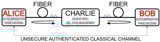 The measurement is broadcast by Charlie. This endows the protocol with MDI robustness. When they announce a no-bit-flip coincidence, Alice and Bob write down the same bit, which can be 0 or 1. Charlie does not know what case it is, but Alice and Bob do, as they know their own choices. For the bit-flip case, one of them, say Bob, needs to flip their bit. In that case, from the outcome, Charlie cannot guess if the phase choice was (bit 0 on the key) or or (bit 1 on the key). With these two pieces of information, the choice of phase and the measurement result, Alice and Bob can write down a shared string of 0 and 1, while Charlie, not privy to the phase choice, would have no information this way. Thus, it is essential that the phase modulators do not leak information outside Alice and Bob’s stations. Note that we assume Alice and Bob to be fully trustworthy; thus, we only have to worry about outside and not inside attacks, as happens in quantum protocols for comparison problems [,], where Alice and Bob compete against each other in a sense. Here, in a QKD context, Alice and Bob are assumed to be fully harmless; they are legitimate parties and communicate over a public but authenticated quantum channel (and a companion unjammable classical channel), as is common in a QKD setting. For the case of Charlie, it is untrusted for the measurement; that is, there is no need to make sure that the measurement devices are trusted at all. That is the main contribution of measurement device independence to the QKD field.
