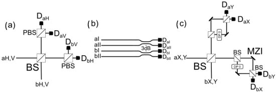 Bell measurement devices. (a) Polarization (Innsbruck scheme), (b) codirectional modes, which are highly compatible with integrated optic devices, (c) collinear modes. In this case, the PBS role is performed by mode-sorting MZIs, consisting of regular MZIs with a Dove prism rotated 0 degrees in one of its arms.