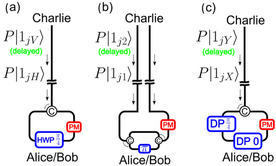 Autocompensating loops for the BSEP protocol for the various encodings. (a) Polarization, (b) codirectional modes, (c) collinear modes. These loops are located at Alice and Bob’s stations and perform the required transformations. Then, the pulses return back to Charlie. The use of delays allows for an independent modulation of the signal states with a fast phase modulator (PM).
