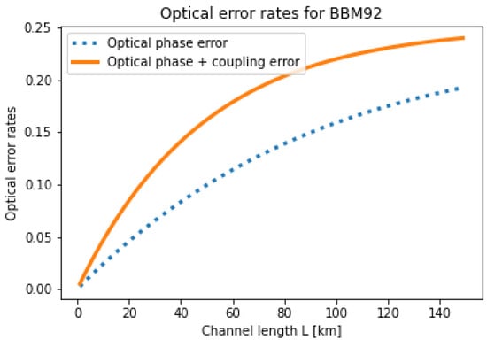 In Figure 5, the variation in the optical error with the distance is shown, which is in turn used to obtain the results shown in Figure 6. We must emphasize that the curves of the secret key rate are critically influenced by the value of fiber attenuation. In fact, if this parameter becomes large enough, then protocols where the light needs to travel longer distances, for example, in BBM92, in order to achieve phase autocompensation exhibit a significant reduction in the secret key rate. On the other hand, without autocompensation, the maximum transmission distances to achieve a secure secret key are relatively short (a few tens of kilometers, as shown by the blue and orange curves in Figure 6), despite having used hypothetical, small values for the phase drift. Therefore, for real optical fibers, such distances would be reduced by up to a few meters. If we use an autocompensated BBM92 protocol, longer distances are achieved (green curve); however, with the plug and play BSEP protocol, much longer transmission distances are obtained, which is the central result of this work.